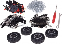 Dieser robuste Metall-Baukasten begeistert Kinder ab 8 Jahren, Teenager und Erwachsene, die Herausforderungen und kreatives Bauen lieben. Durch die Kombination aus Metallleisten, Trägern und Verbindern mit Kunststoffteilen und großen Gummireifen wirkt das fertige Modell realistisch und ist stabil.