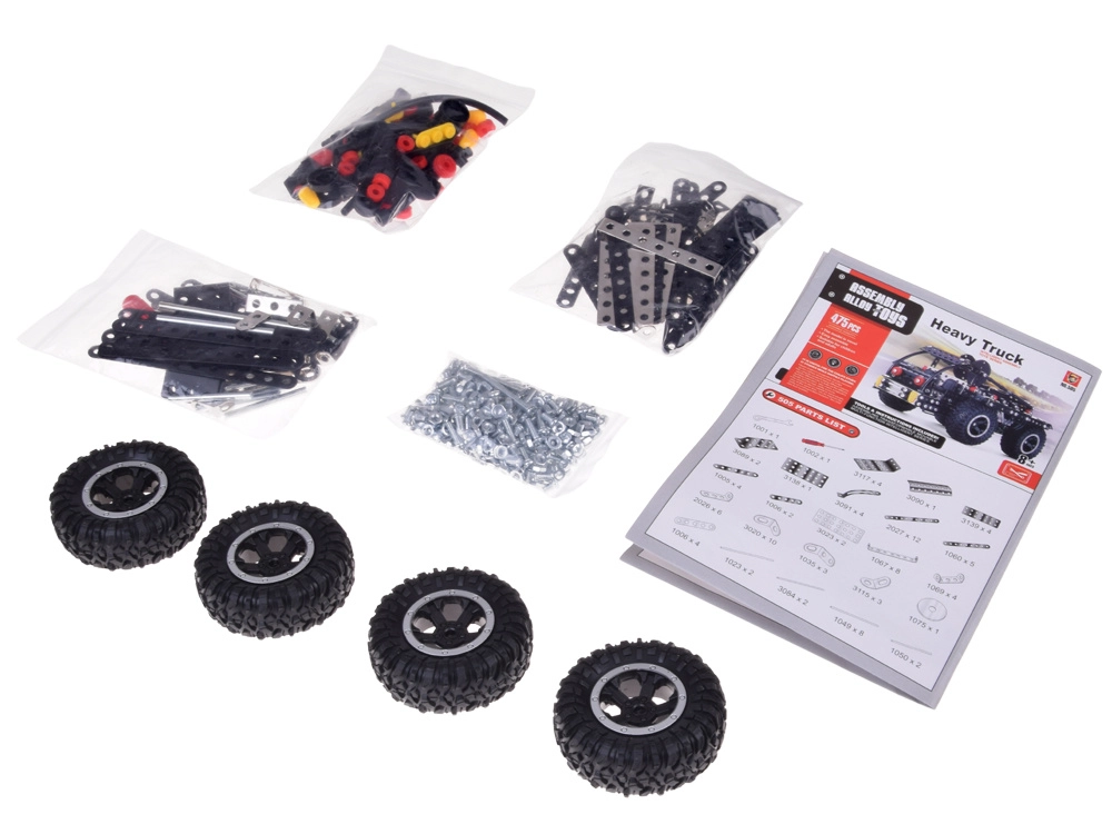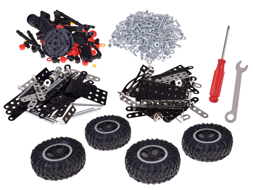 Alles Nötige in einer Box: 475 Teile, Gummireifen, Kunststoff-Zubehör, Schrauben und Muttern, Schraubendreher, Schlüssel und bebilderte Anleitung.