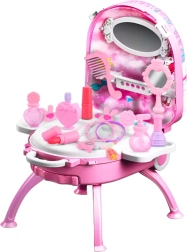 Enthalten sind Armbänder, eine Perlenkette, Ringe, ein Kamm, ein Herzspiegel sowie Imitate von Lippenstiften, Lack und „Parfüms“ – alles aus kindersicherem Kunststoff für fantasievolle Verkleidungen und Rollenspiele. Das gesamte Set ist leicht, robust und dank ausziehbarem Griff und Rollen einfach zu transportieren.