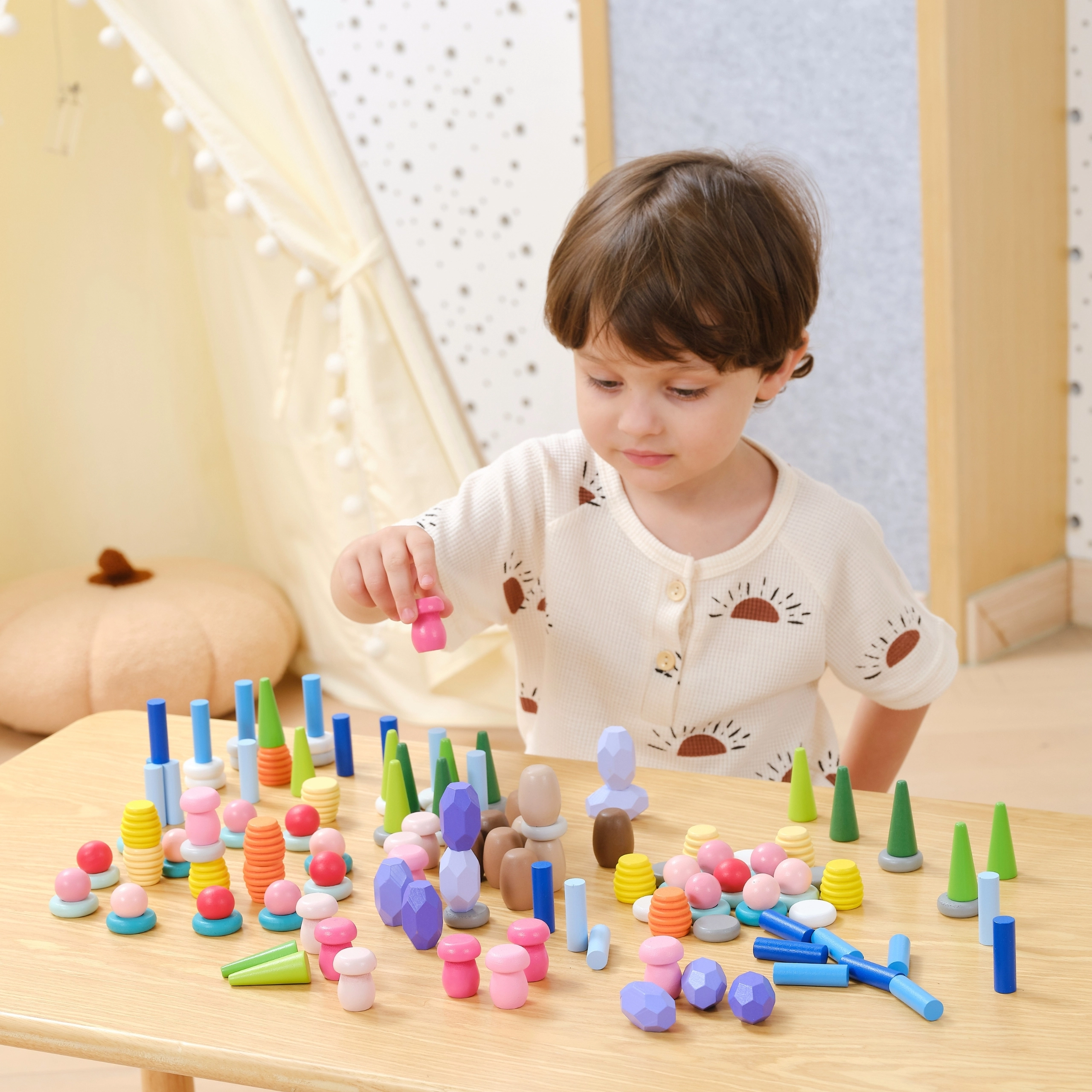 Dieses Montessori-Set bietet freies, nicht durch Regeln eingeschränktes Spielen. Die an Pilze, Waben, Steine, Kegel, Ringe oder Figuren erinnernden Teile lassen sich beliebig kombinieren, schichten und ausbalancieren. Kinder trainieren dadurch Greifen, Hand-Auge-Koordination sowie Konzentration und eigenständiges Problemlösen.