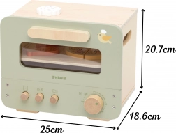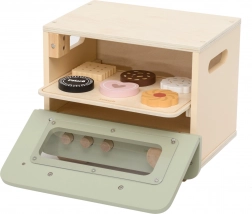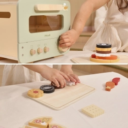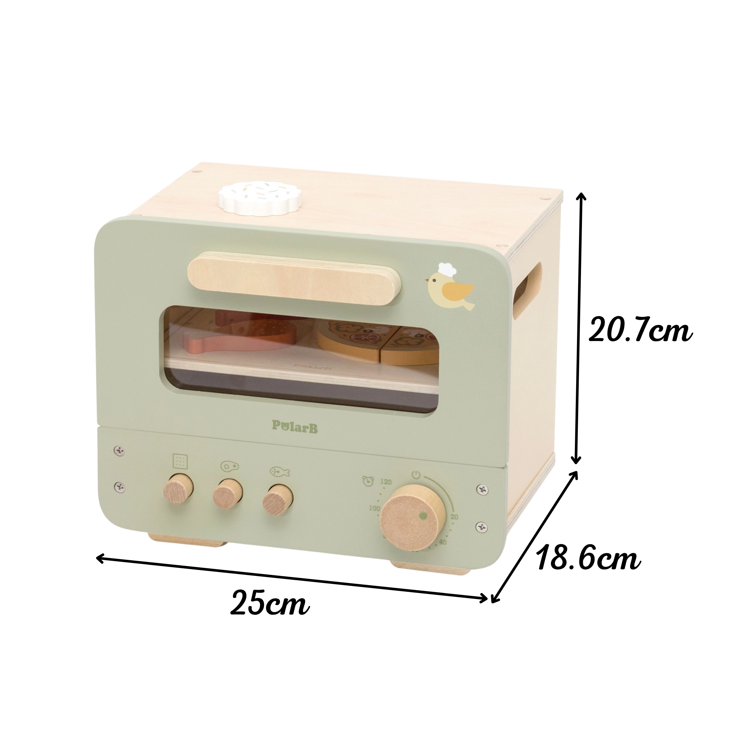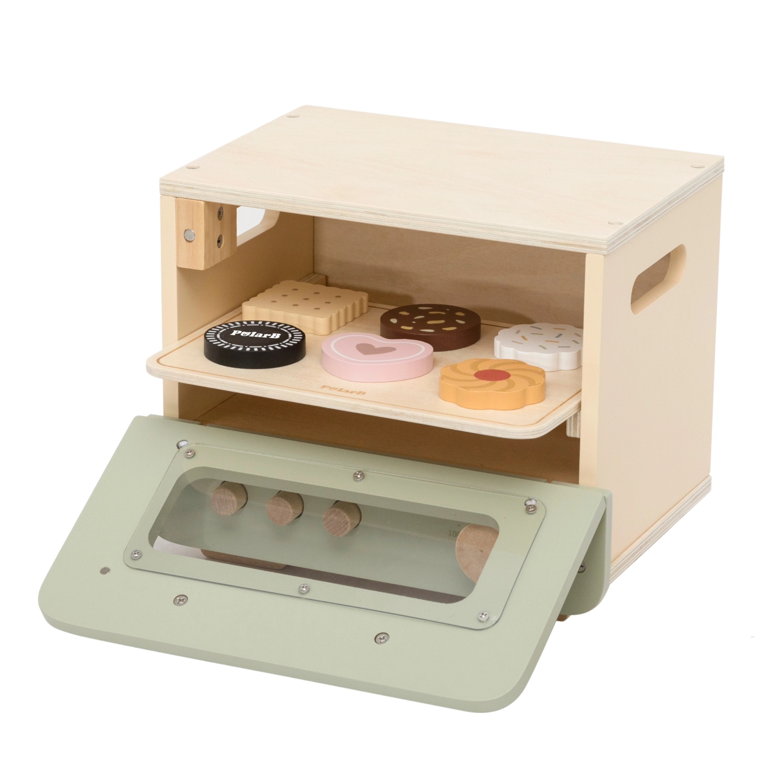Dieser stilvolle Kinderofen in Grün-Beige bietet ein authentisches Backerlebnis. Das transparente Fenster, funktionsfähige Drehknöpfe und das abnehmbare Blech laden zum fantasievollen Servieren süßer und herzhafter Leckereien ein. Kinder können die Mini-Pizza schneiden und zusammensetzen, Kekse backen und dabei Geschicklichkeit sowie Kommunikation im Rollenspiel trainieren.