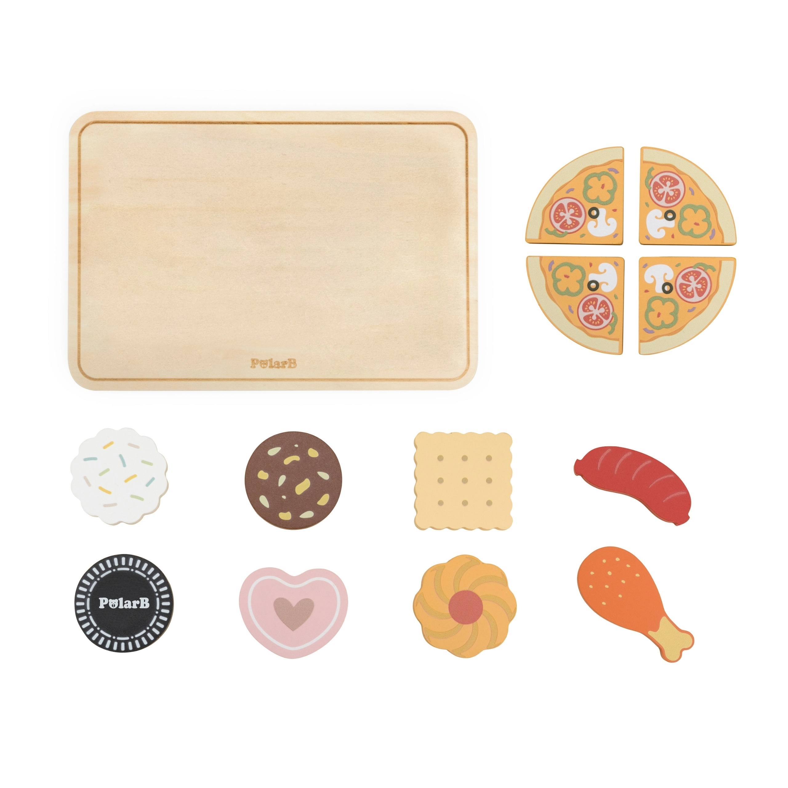 Inklusive Backblech, 6 Keksen in verschiedenen Formen, Mini-Pizza aus 4 Stücken, Würstchen und Hähnchenkeule – alles servierbereit.