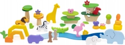 Dieses farbenfrohe Holzset entführt Kinder in die Welt der Tropen und die afrikanische Savanne. Figuren wie Elefant, Giraffe, Zebra, Löwe, Krokodil und Flamingo werden durch Bäume, Blumen, eine Brücke und einen Fluss aus Einzelelementen ergänzt, um vielfältige Szenen zu gestalten. Dank robuster, glatt verarbeiteter Teile sind die Elemente gut greifbar und sicher für Kinderhände.