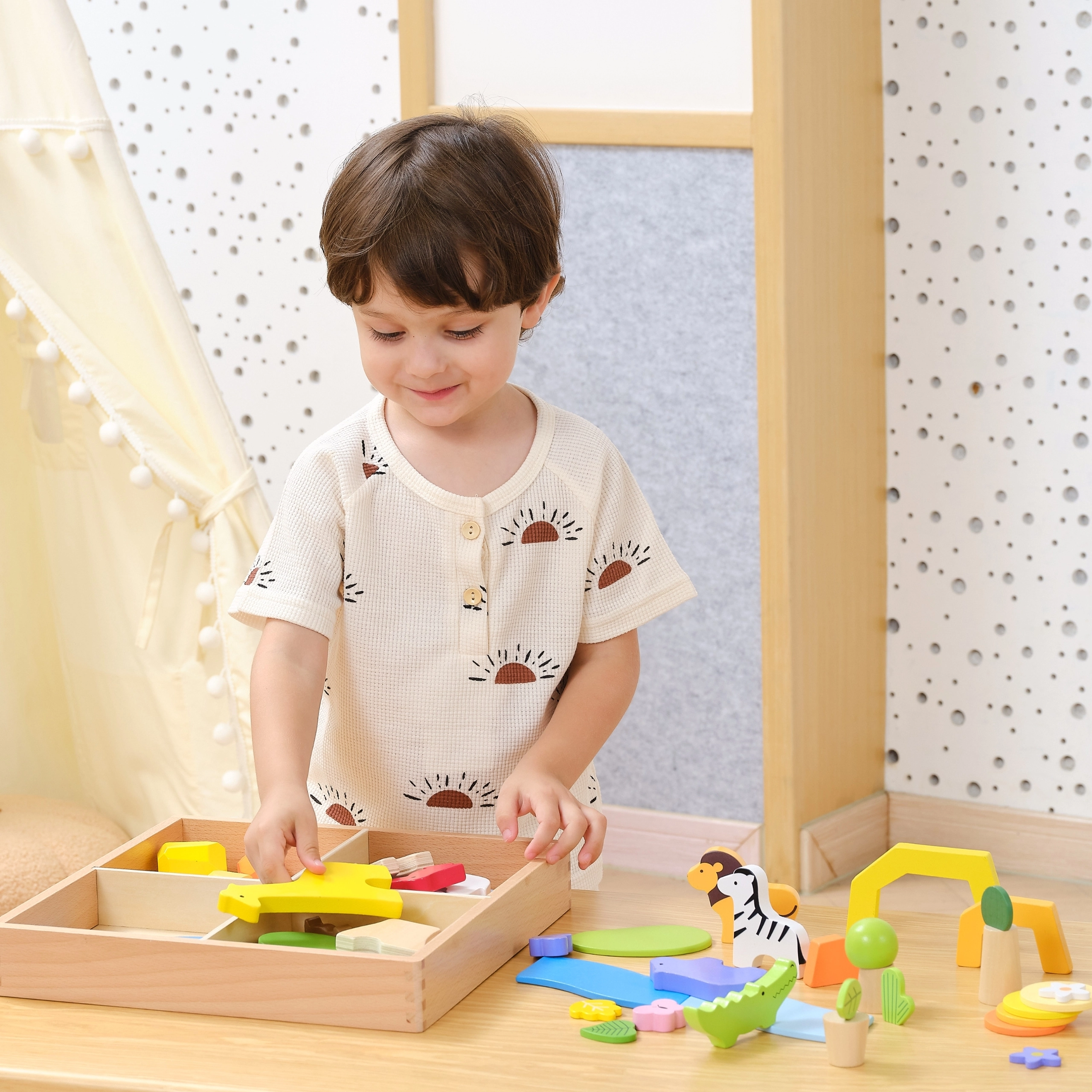 Das Spiel fördert auf natürliche Weise Feinmotorik, Augen-Hand-Koordination, Sortieren und Bauen sowie die Fähigkeit, Geschichten zu erzählen. Das offene Konzept unterstützt selbstständiges Spiel und Konzentration im Sinne der Montessori-Pädagogik. Dank der Holzbox mit Fächern gelingt das Verstauen übersichtlich und schnell.