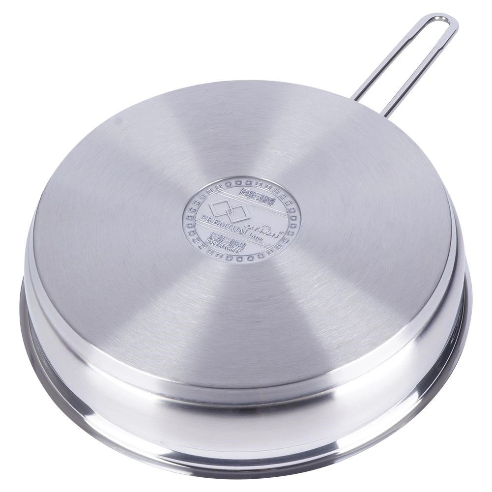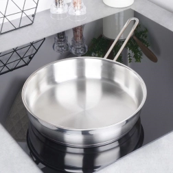 Diese Edelstahlpfanne mit zeitlosem Design ist eine ausgezeichnete Wahl für die Zubereitung von Fleisch, Gemüse und Pfannkuchen. Hergestellt aus hochwertigem Edelstahl mit matter Oberfläche und einem eleganten polierten Streifen am oberen Rand, bietet sie eine lange Lebensdauer und Korrosionsbeständigkeit. Massive Wände und eine stabile Konstruktion gewährleisten eine gleichmäßige Wärmeverteilung und zuverlässige Leistung beim Braten und Anbraten.