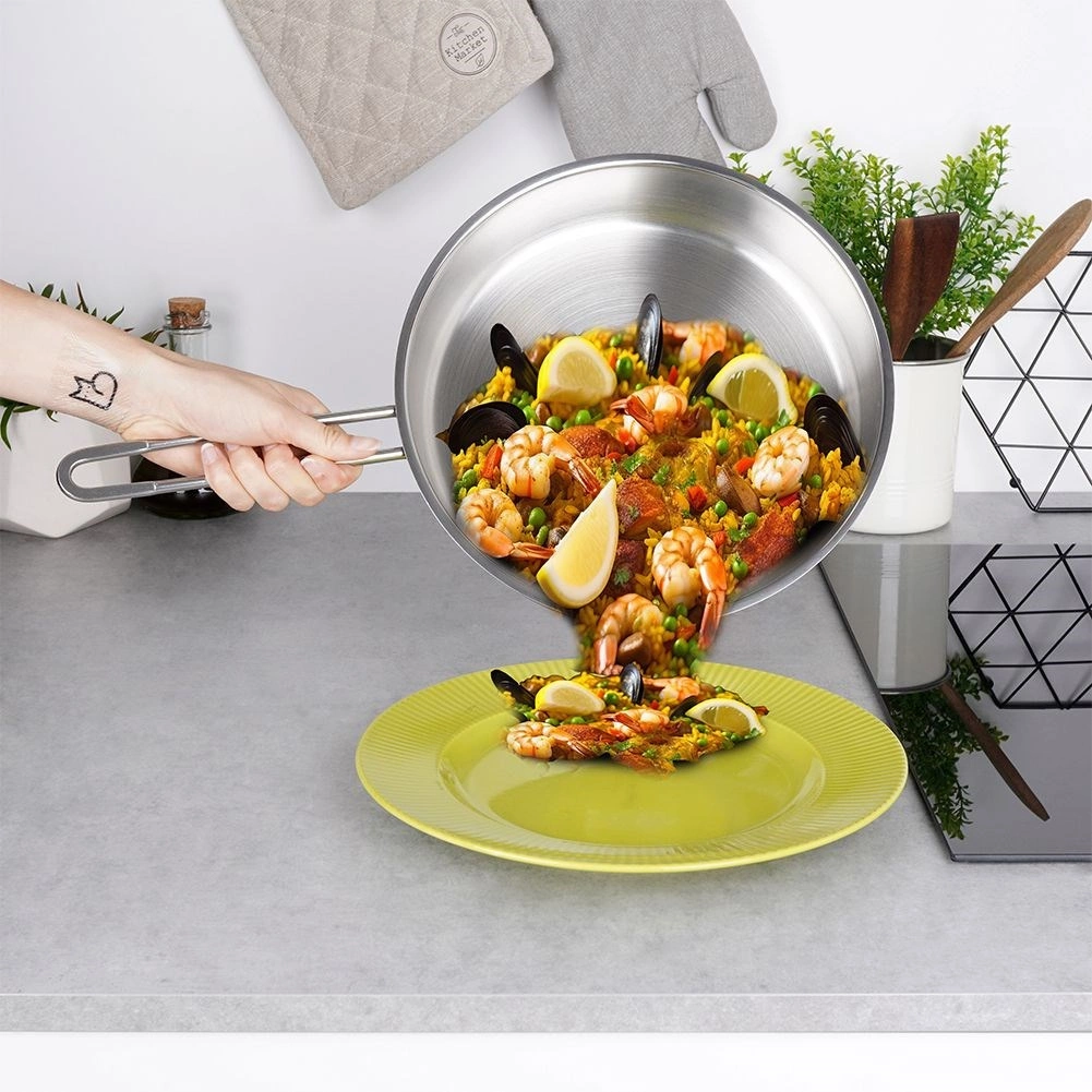Der mehrschichtige, energiesparende Boden leitet und speichert die Wärme hervorragend, sodass Sie ein schnelles Aufheizen, Energieeinsparungen und großartige Kochergebnisse erzielen. Die Pfanne ist kompatibel mit Gas-, Elektro-, Glaskeramik-, Halogen- und Induktionskochfeldern. Dank des gut geformten Korpus und der Spülmaschinengeeignetheit ist die Pflege einfach und schnell.