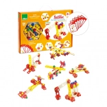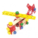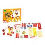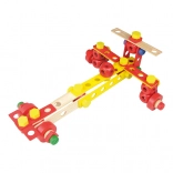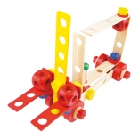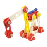 Farbige und naturbelassene Leisten, Schrauben, Muttern, Räder und Verbinder ermöglichen es Kindern, Fahrzeuge und fantasievolle Konstruktionen zu bauen und immer wieder umzubauen.
