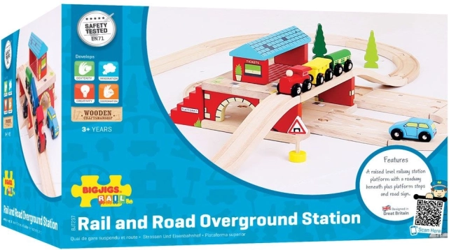 Dieses farbenfrohe Holzspielzeug repliziert ikonische Londoner Overground-Stationen. Es enthält erkennbare Londoner Zeichen, einen Taxistand, ein Ticketschalter und Treppen zum Bahnsteig, was dieses Spielzeug zu einer großartigen Ergänzung jedes Holz-Eisenbahnsets macht. Der Große Bahnhof Über der Straße ermöglicht den Straßenverkehrsteilnehmern unter der Station hindurchzufahren, während der Zug ankommt und abfährt. Er verbindet die Eisenbahnstrecke mit der Straße, was den Kindern unzählige Möglichkeiten zur Interaktion und zum Spielen bietet.
