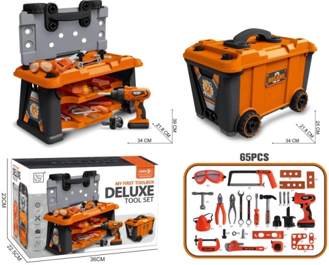 Das tragbare Werkstatt-Set für kleine Heimwerker in einem praktischen Rollkoffer begeistert jeden kleinen Baumeister. Es enthält bis zu 65 Teile, darunter eine kinderfreundliche Akku-Bohrmaschine, Schutzbrille und Zubehör. Kompakte Maße und eine clevere Aufbewahrung sorgen für leichtes Transportieren und schnelles Aufbauen der Werkbank überall. Ideal als Spielzeug zur Förderung von Kreativität und Feinmotorik für Kinder ab 3 Jahren.