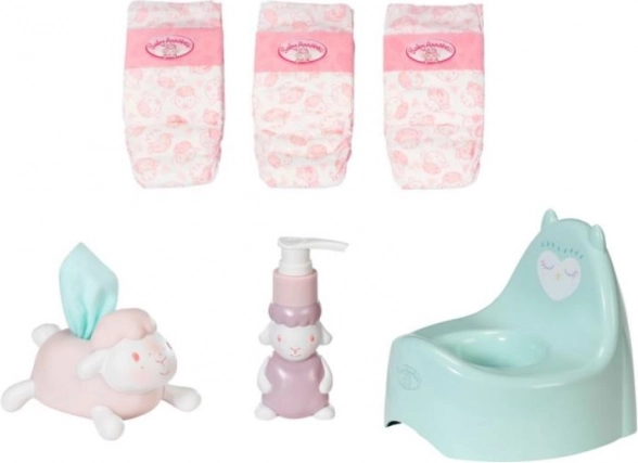 Das **Baby Annabell Töpfchen-Set** ist ideal für kleine Puppenmütter, die ihrer Baby Annabell beim Erwachsenwerden helfen möchten. Das Set besteht aus einem mintgrünen Töpfchen mit einem niedlichen Eulenmotiv auf der Rückseite, das mit charmanten Öhrchen verziert ist, und dient als perfekte Stütze für die Puppe.