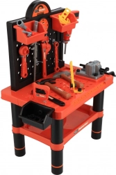 Die Arbeitsplatte mit Bohrlöchern, Platz für einen Schraubstock und aufgedruckter Skala unterstützt realistisches Spiel und die Entwicklung der Feinmotorik.