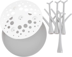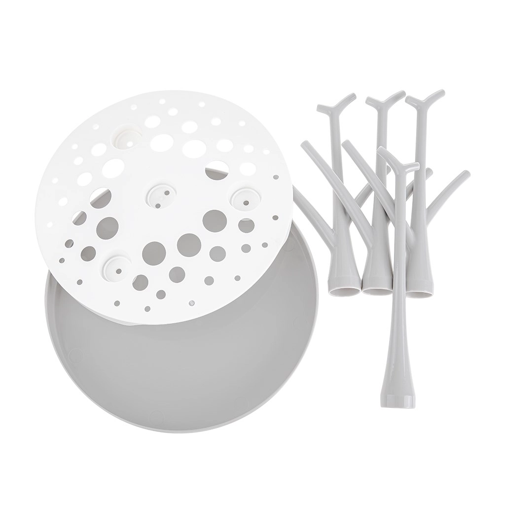 Verzweigte Stifte halten Flaschen, Sauger und Zubehör aufrecht, damit das Wasser schnell ablaufen kann und alles rascher trocknet.