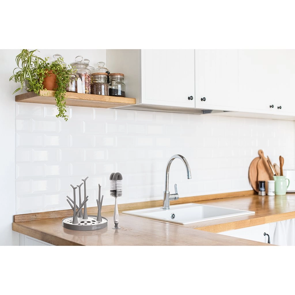Das AKUKU-Set aus zwei Bürsten wurde für ein schnelles und effizientes Reinigen von Babyflaschen, Saugern und schmalen Gefäßen entwickelt. Der ergonomische Griff erleichtert das Halten, dichte Borsten und die Schwammspitze entfernen Verschmutzungen auch aus schwer erreichbaren Bereichen. Dank des Saugnapfs lassen sich die Bürsten leicht neben dem Spülbecken aufstellen, wo sie hygienisch trocknen und stets griffbereit sind.