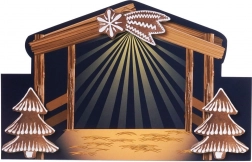 Enthalten ist ein farbiges Stallkulissen-Hintergrund, durch das Ihre selbstgemachte Lebkuchen- oder Keks-Krippenszene besonders gut zur Geltung kommt.
