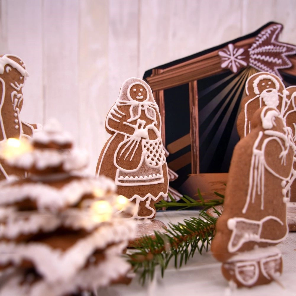 Das Set umfasst die Krippenfiguren sowie ein dekoratives Hintergrundmotiv, sodass Sie nach dem Backen ganz einfach eine wirkungsvolle Weihnachtsdekoration für Tisch oder Fensterbank gestalten.