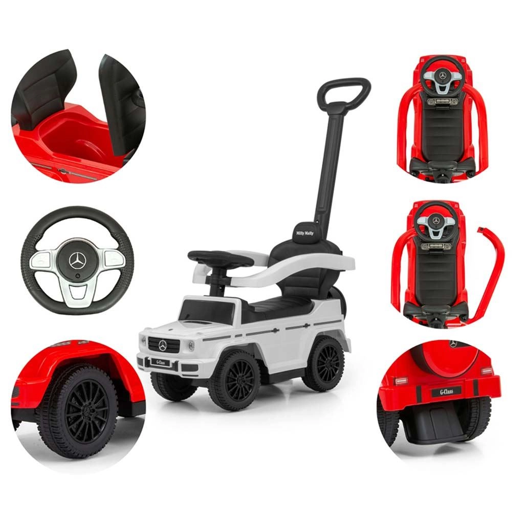 Stilvolles Kinder-Laufrad mit MERCEDES-Lizenz, inspiriert vom Modell G‑Class, bietet sicheres Fahren und jede Menge Spaß für Kinder von 12 bis 36 Monaten. Es verfügt über eine Schiebestange für Eltern, drehbare Vorderräder, einen breiten Sitz mit Stauraum sowie Soundeffekte am Lenkrad. Dank der abnehmbaren Seitenlehnen, Fußstützen und Stange lässt es sich leicht vom Begleitfahrzeug zum eigenständigen Laufrad umbauen.