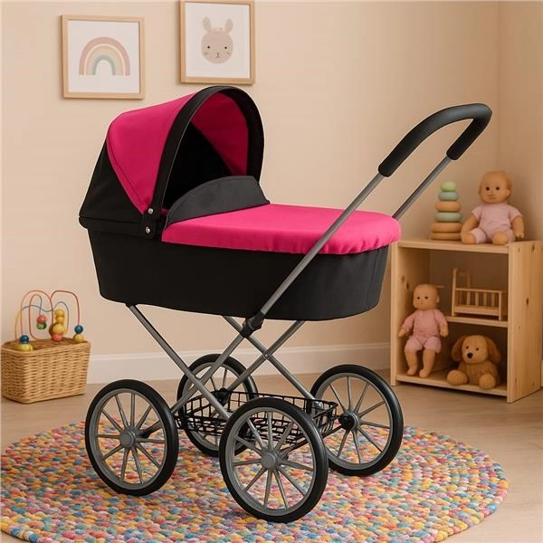Stilvoller Kinder-Puppenwagen im Retro-Design, der kleine Mamas begeistert. Er bietet ein klappbares Verdeck, einen geräumigen Korb, einen weichen Griff und eine stabile Konstruktion mit großen Rädern für eine angenehme Fahrt auf verschiedenen Untergründen.