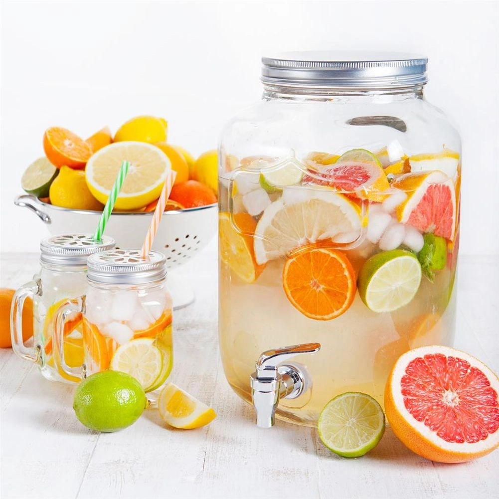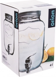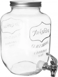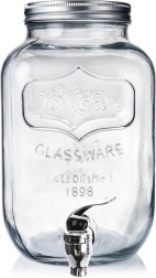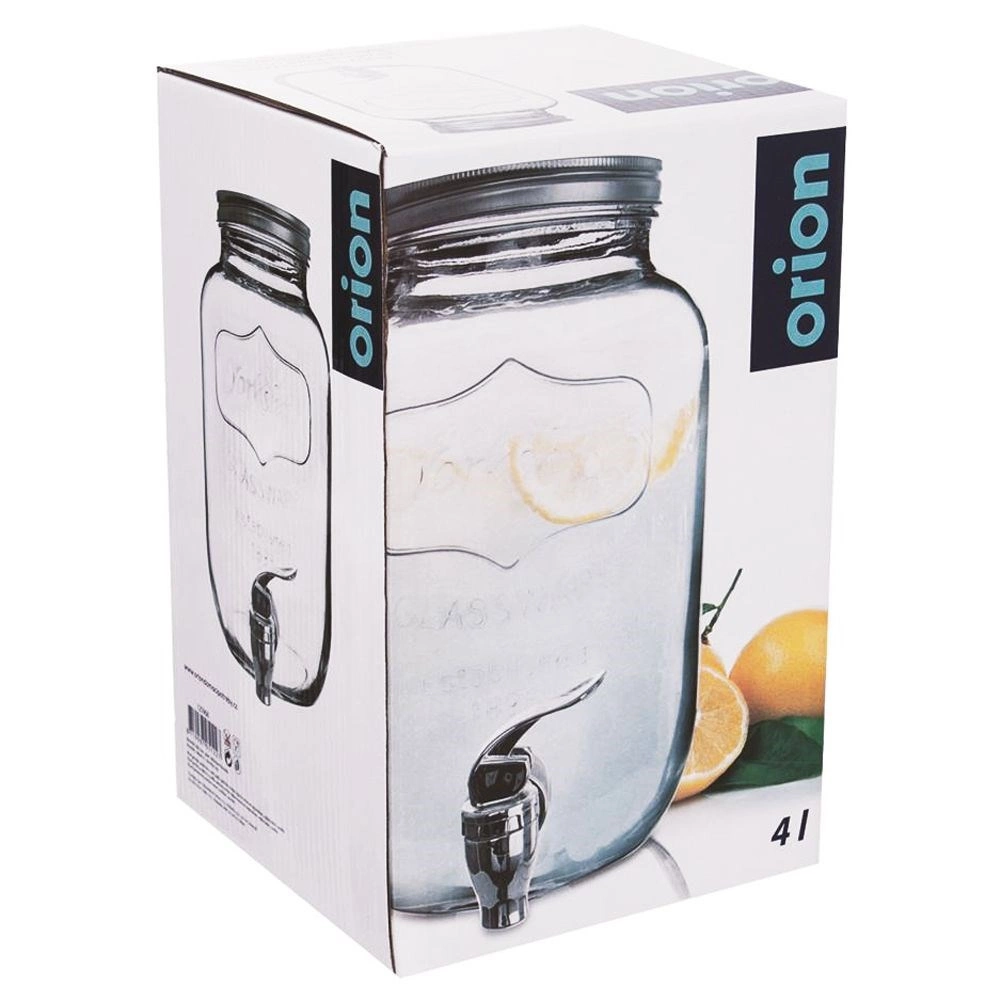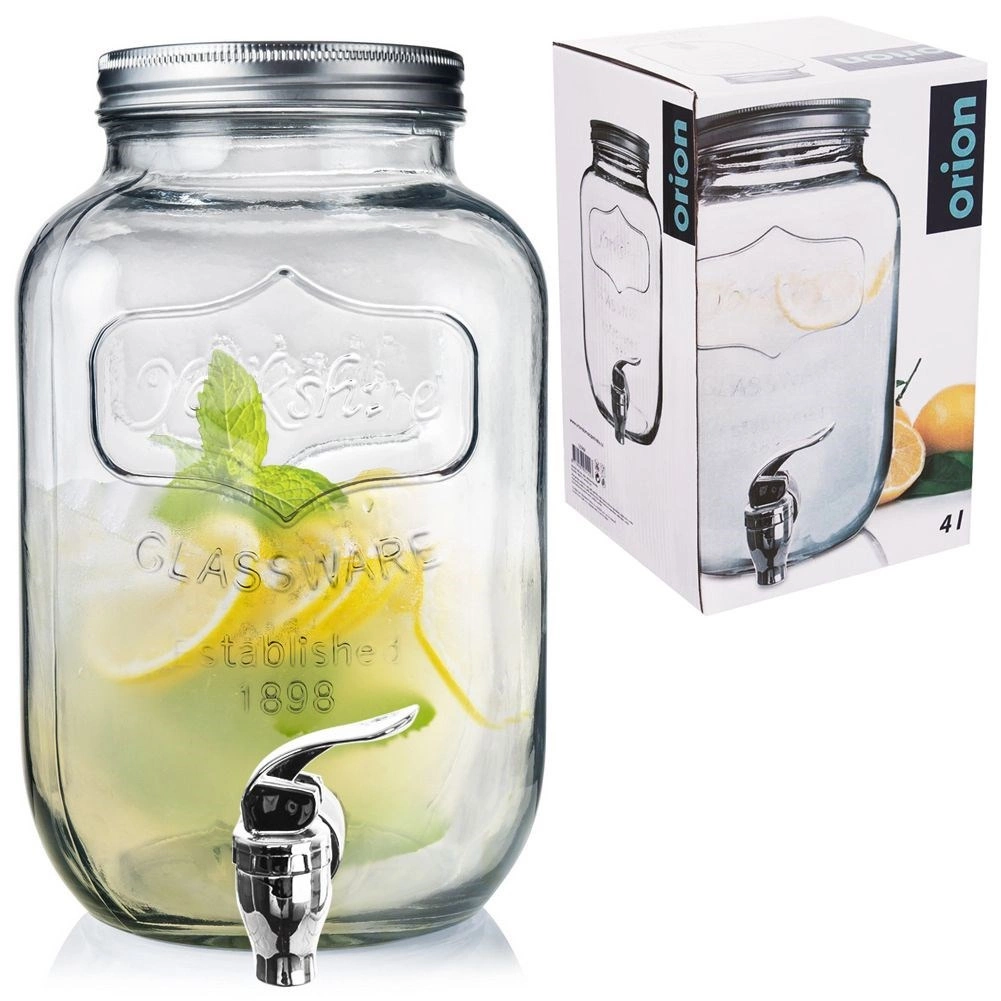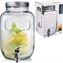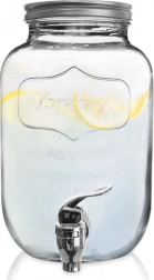 Stilvoller Getränkespender aus Glas mit einem Volumen von 4 l, Metall-Schraubdeckel und praktischem Zapfhahn für komfortables Ausgießen. Ideal für Limonade, Fruchtwasser, Punsch oder Iced Tea. Verfügt über eine weite Öffnung für einfaches Befüllen und Reinigen, lebensmittelsichere Materialien und einen verschließbaren Deckel, der das Getränk vor Insekten schützt.