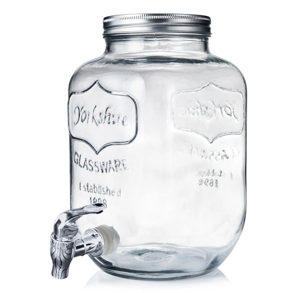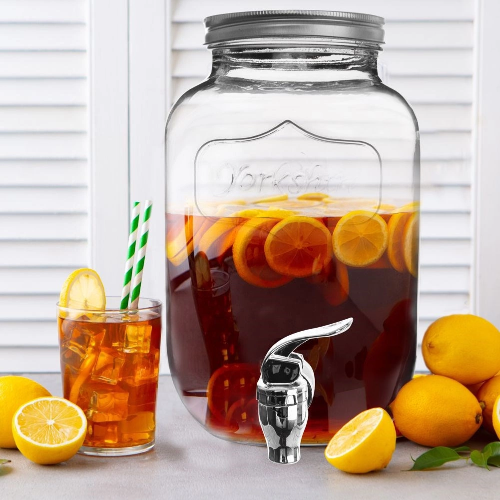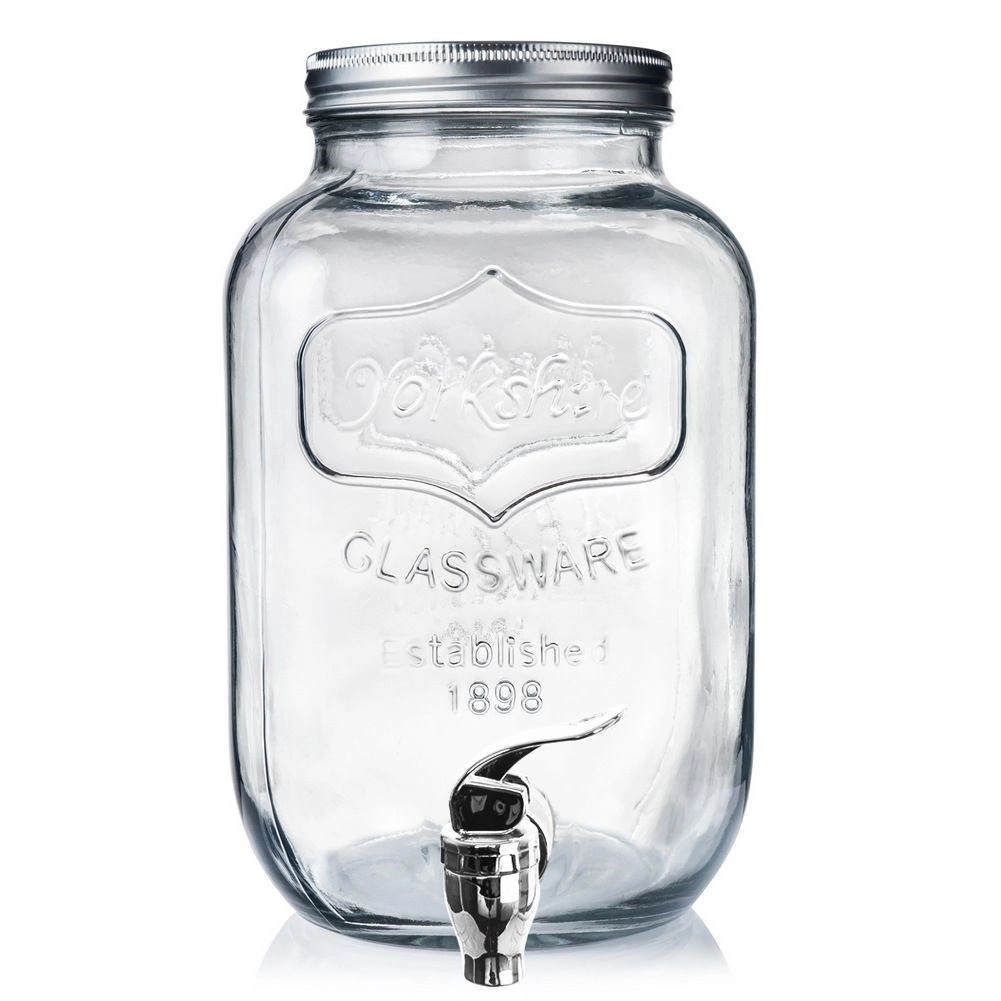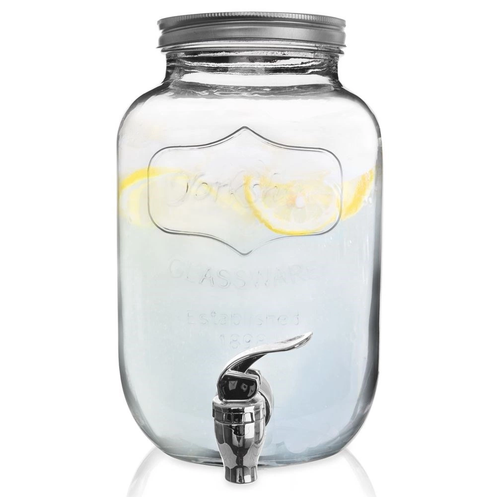 Stilvoller Getränkespender aus Glas mit einem Volumen von 4 l, Metall-Schraubdeckel und praktischem Zapfhahn für komfortables Ausgießen. Ideal für Limonade, Fruchtwasser, Punsch oder Iced Tea. Verfügt über eine weite Öffnung für einfaches Befüllen und Reinigen, lebensmittelsichere Materialien und einen verschließbaren Deckel, der das Getränk vor Insekten schützt.