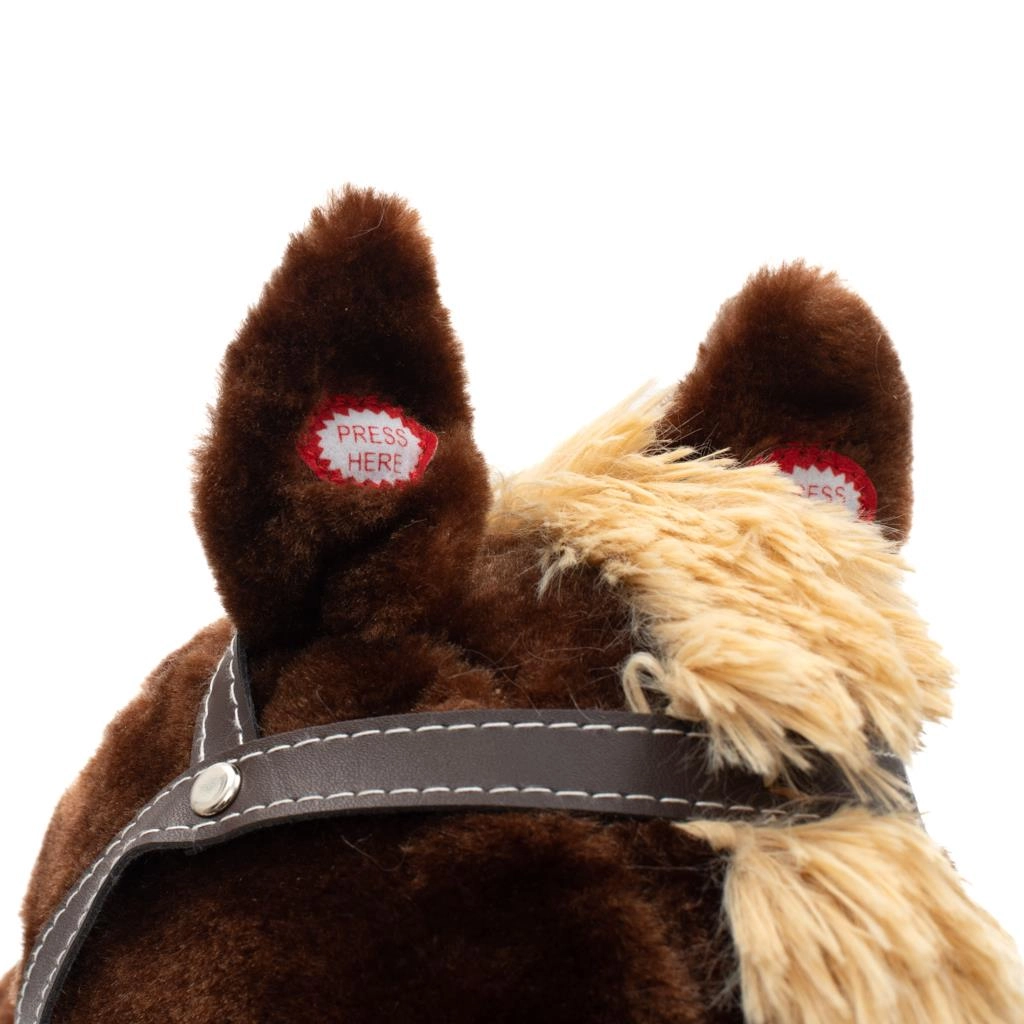 Beim Drücken der Ohren wiehert das Pferd, galoppiert, singt ein Cowboylied und bewegt Schwanz und Maul. Ein Spaß, der Kinder lange begeistert.