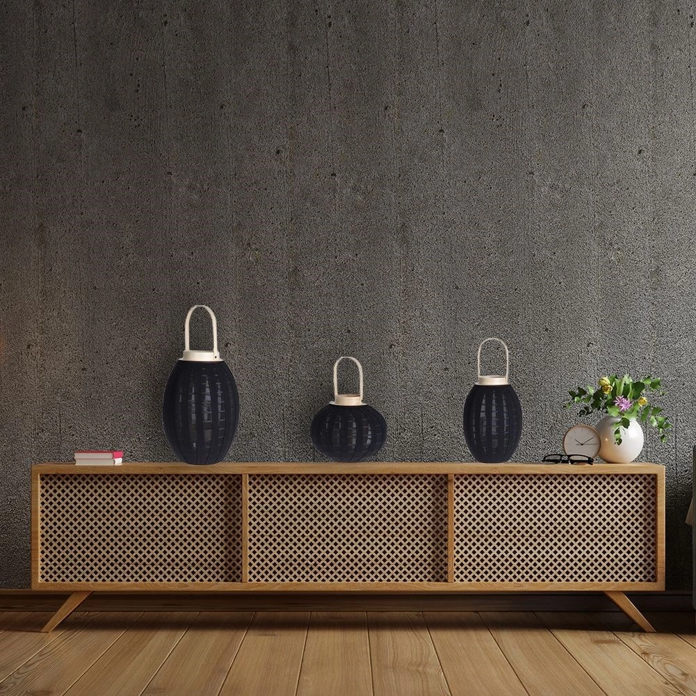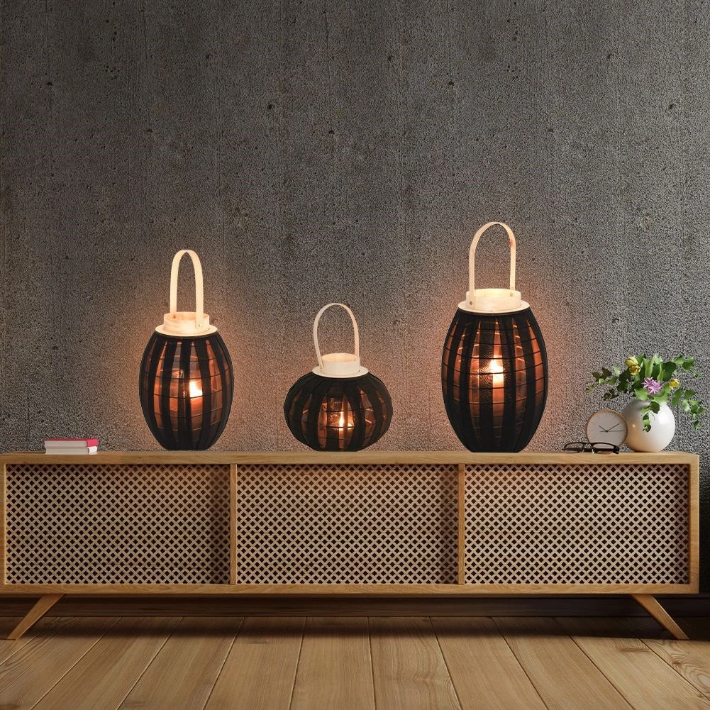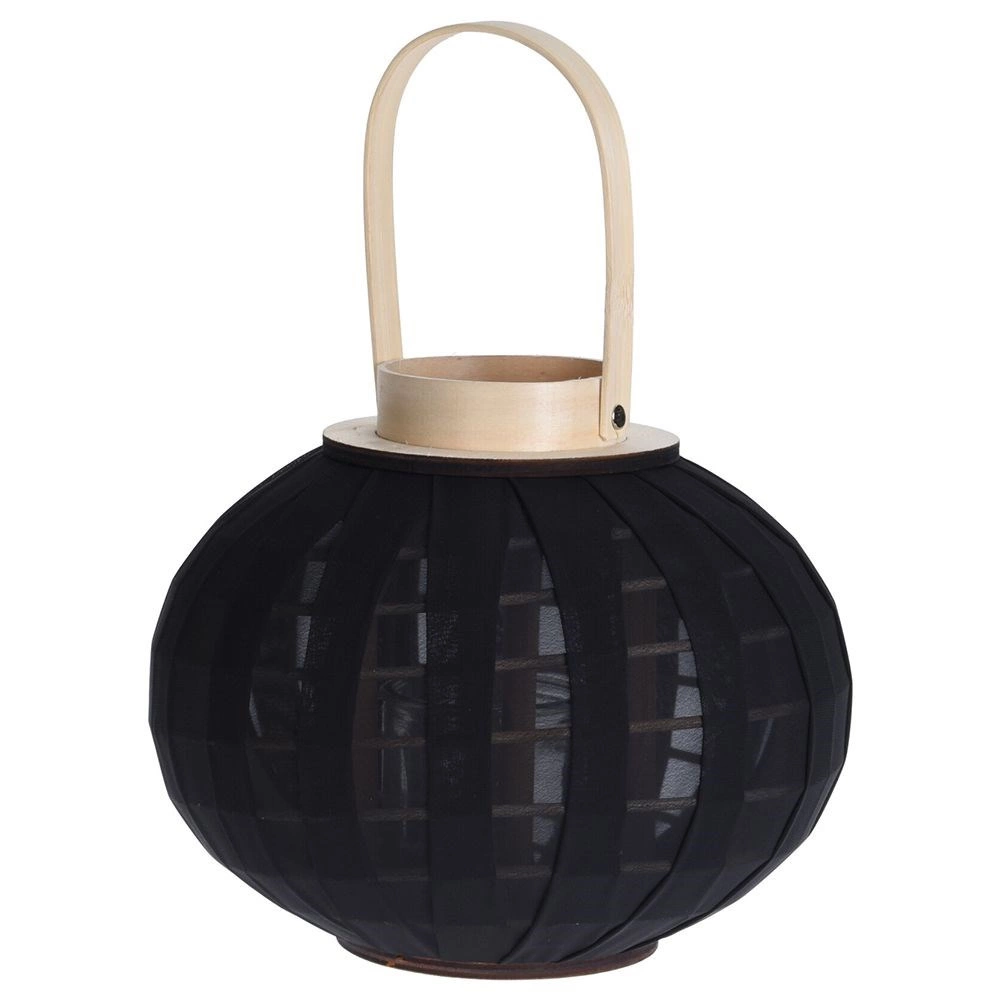 Eleganter schwarzer Lampion mit natürlichem Holzgriff, der eine angenehme Atmosphäre schafft und die Flamme sicher in einem Glaszylinder birgt. Dank der kompakten Maße 22 × 24 cm eignet er sich für Tisch, Regal sowie als Dekoration für Terrasse oder Balkon.