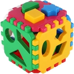 Der Lieferumfang umfasst Teile zum Zusammensetzen des Würfels sowie ein Set von Formen zum Durchstecken durch die entsprechenden Öffnungen. Die robuste Kunststoffausführung und die kompakten Maße von 12 × 12 × 12 cm machen ihn zum idealen Spielzeug für zu Hause und unterwegs.