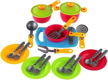Dieses bunte Geschirr-Set mit Schneidebrett ist perfekt für Kinderküchen und Rollenspiele rund ums Kochen. Leichter, aber robuster Kunststoff sorgt für sicheres und langlebiges Spielen, wobei die einzelnen Teile gut in Kinderhänden liegen.