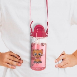 Niedliche Kinderflasche aus robustem Tritan mit 490 ml Fassungsvermögen, klappbarem Deckel, integriertem Strohhalm und verstellbarem Tragegurt. Ideal zum Trinken zu Hause und unterwegs. BPA-frei, leicht und bruchsicher, mit auslaufsicherer Silikondichtung und leicht zu reinigen.