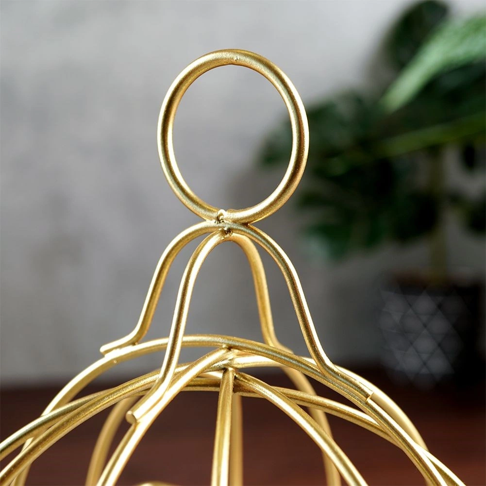Die elegante, von einer Käfigform inspirierte Laterne schafft mit ihrem sanften Licht eine angenehme Atmosphäre und dient zugleich als auffällige Dekoration. Der langlebige Metallrahmen mit goldener Oberfläche sorgt für eine lange Lebensdauer und eine zeitlose Optik, die auf Tisch, Kommode oder Regal zur Geltung kommt.