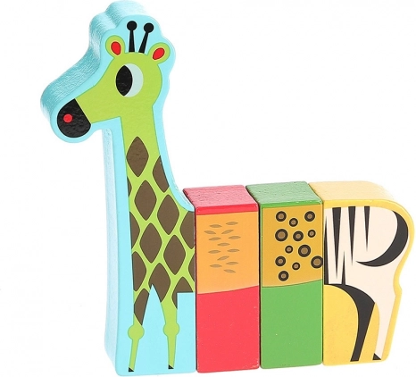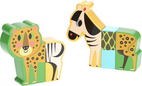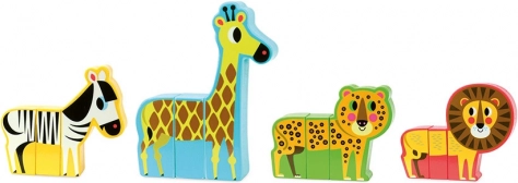 Vier Safari-Tiere mit magnetischen Teilen lassen sich frei untereinander kombinieren – perfekt zur Förderung von Kreativität und Fantasie.