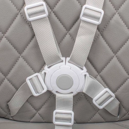 Weiche Polsterung aus Ökoleder, seitliche Stütze und 5-Punkt-Gurte sorgen bei jeder Mahlzeit für Stabilität und Sicherheit des Kindes.