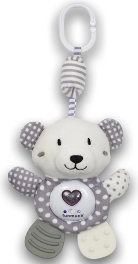 Dieser farbenfrohe Plüsch-Teddy ist der ideale Begleiter für Ihr Baby zu Hause und unterwegs. Er fasziniert mit Lichtern und Melodien, stimuliert Gehör und Sehsinn und vibriert nach dem Aufziehen angenehm, was das Baby beruhigt. Bunte Beißringe helfen beim Zahnen und fördern die motorische Entwicklung.
