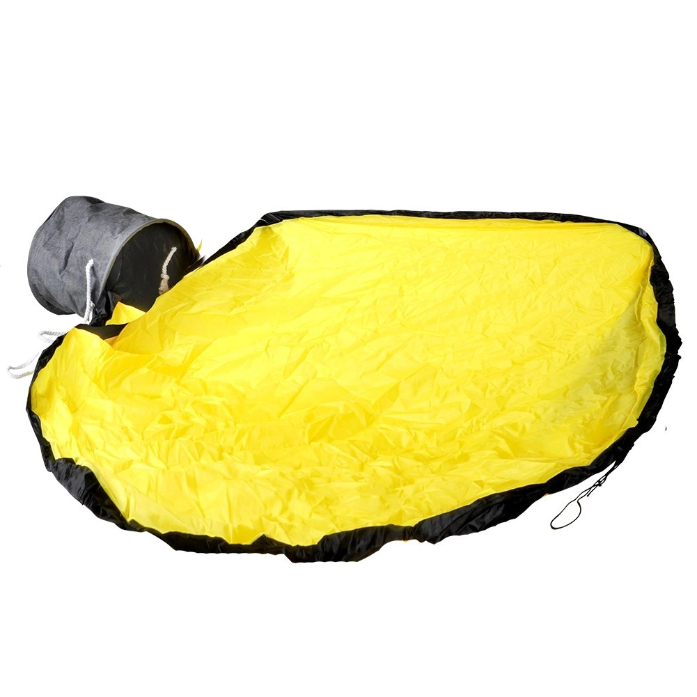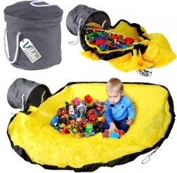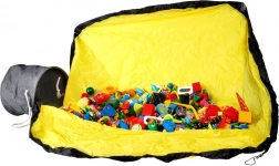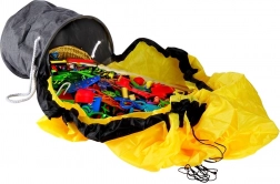 Die große gelbe Matte mit schwarzer Umrandung wird nach dem Spielen per Kordel zusammengezogen und wird zum Beutel – Spielsachen verschwinden nicht unter Möbeln und das Aufräumen ist in einer Minute erledigt.