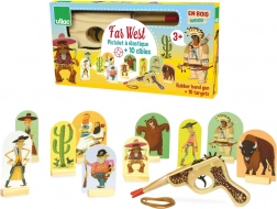 Erleben Sie die Atmosphäre des Wilden Westens mit dieser hölzernen Pistole mit Zielscheiben der Marke VILAC. Das Spiel ist ideal für Kinder ab 3 Jahren und hilft, die Präzision zu trainieren, die Konzentration zu fördern und die Feinmotorik zu verbessern. Einfach das Gummiband spannen, die Zielscheiben aufstellen und los schießen – Spaß für die ganze Familie.
