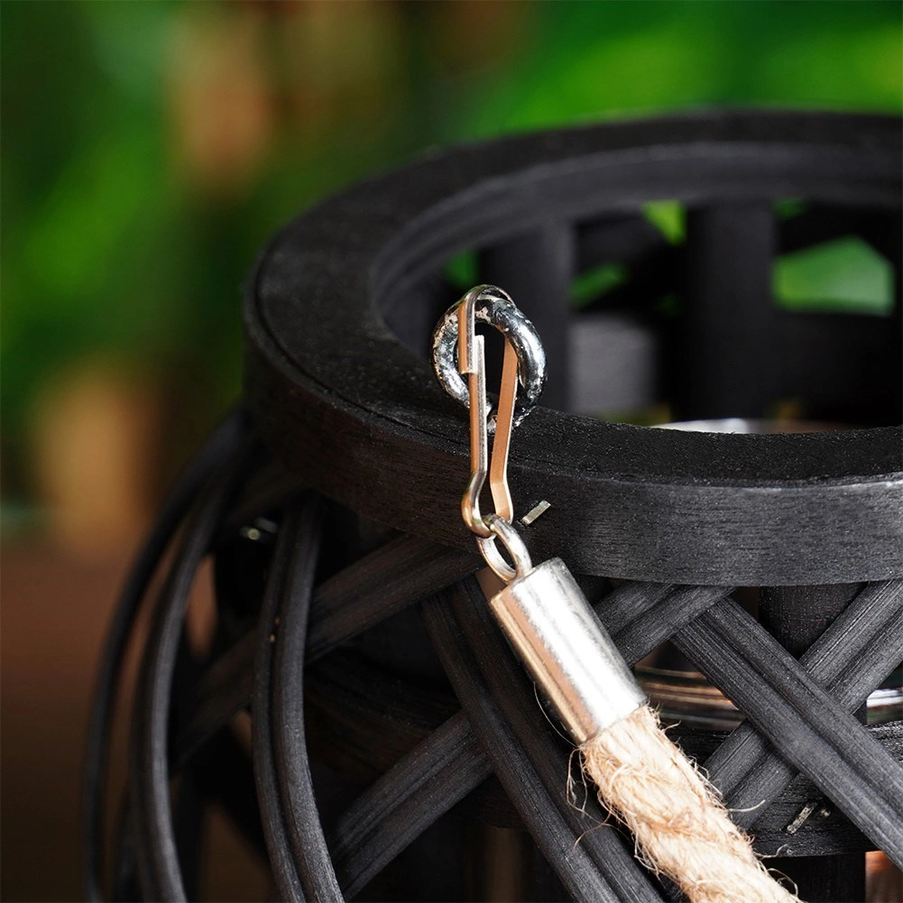 Im Inneren befindet sich ein herausnehmbarer Glaseinsatz, der Rußbildung verhindert und die Sicherheit beim Kerzenbrennen erhöht. Der robuste Jutegriff mit Metallbeschlägen ermöglicht Aufhängen oder einfaches Tragen, sodass Sie den Lampion auf Tisch, Kommode, Boden platzieren oder im Pavillon aufhängen können.