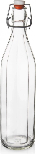 Praktische Glasflasche mit 1 l Fassungsvermögen und Swing-Top-Verschluss für 100 % Dichtheit. Kristallklares Glas betont den Inhalt elegant und das Retro-Design passt in jede Küche. Ideal für Säfte, Limonaden, Sirupe, Liköre und Öle.