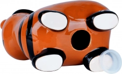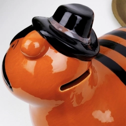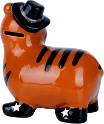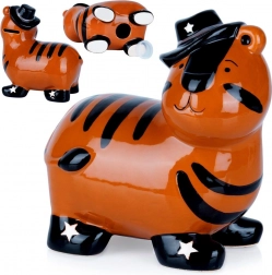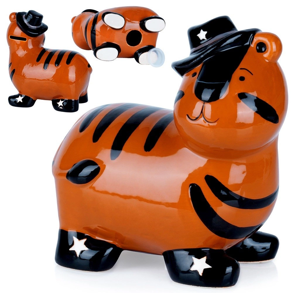 Diese keramische Spardose in Tigerform verbindet Funktionalität mit dekorativem Design. Die glänzende orangefarbene Oberfläche mit schwarzen Streifen, Hut und Sternen auf den Schuhen verleiht einen verspielten Charakter, der sowohl Kinderzimmer als auch moderne Innenräume belebt. Dank der Bodenöffnung mit herausnehmbarem Stöpsel können Ersparnisse wiederholt entnommen werden, ohne die Spardose zu zerbrechen.