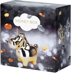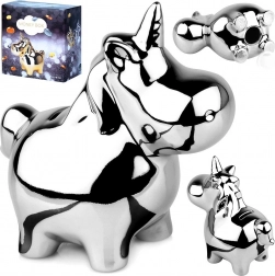 Stilvolle Spardose in Einhornform aus silberner Keramik mit spiegelndem Glanz. Ideal zum Aufbewahren von Münzen und Geldscheinen und zugleich ein dekoratives Accessoire im modernen Stil. Dank des praktischen Bodenverschlusses lässt sie sich leicht entleeren, ohne zu zerbrechen. Ein ideales Geschenk für Kinder und Erwachsene und ein elegantes Wohnaccessoire.