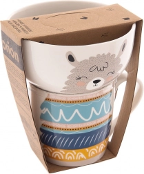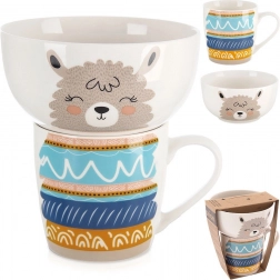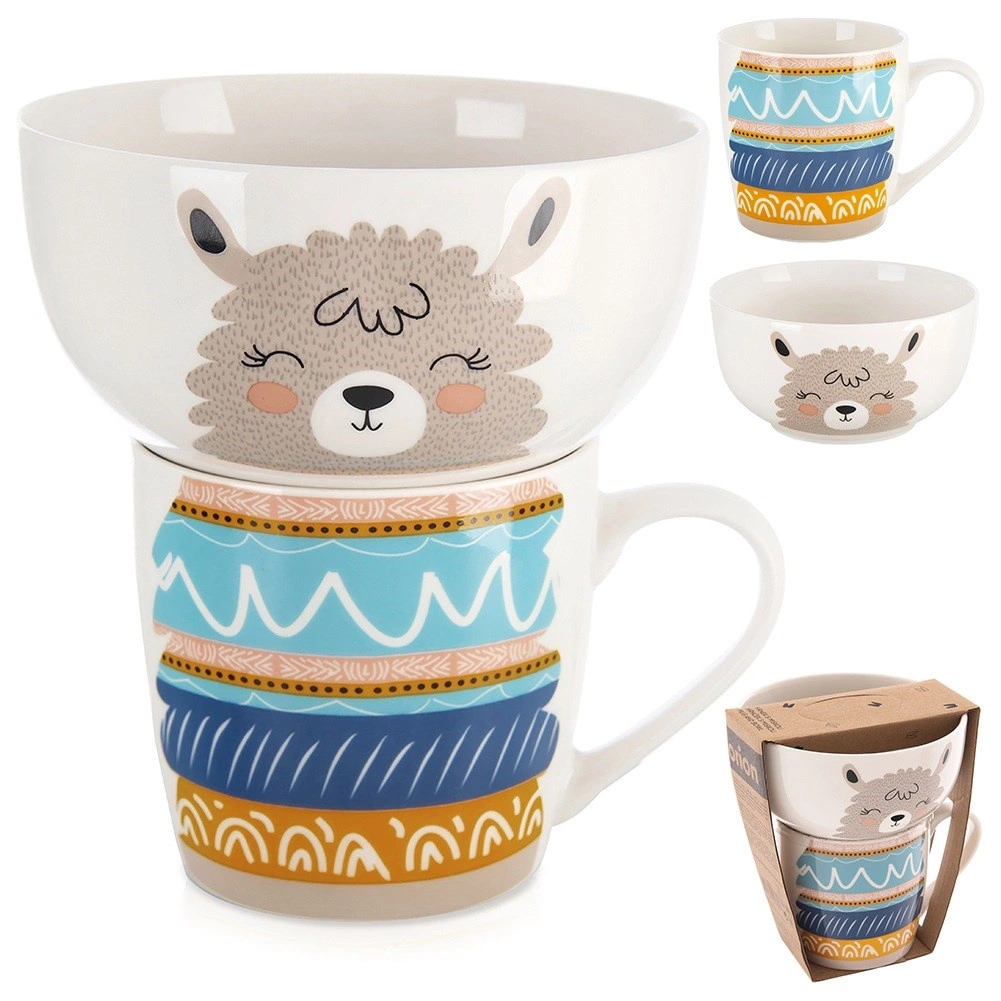 Tasse und Schüssel ergeben zusammen ein Lama-Motiv. Der verspielte Druck fördert die Freude am Essen und verschönert jede Mahlzeit.