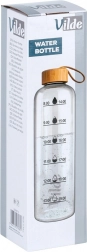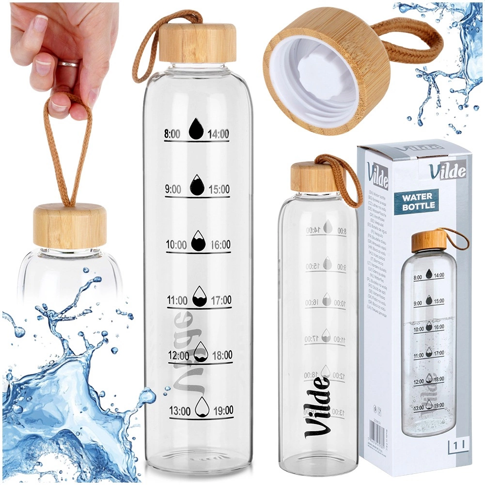 Stilvolle Glas-Wasserflasche mit einem Volumen von 1 l aus robustem Borosilikatglas mit Bambus-Schraubdeckel und Textilschlaufe. Dank der Silikondichtung auslaufsicher, und die Zeitmarkierungen am Flaschenkörper motivieren zum regelmäßigen Trinken über den Tag. Geeignet für heiße und kalte Getränke, pflegeleicht und spülmaschinenfest.