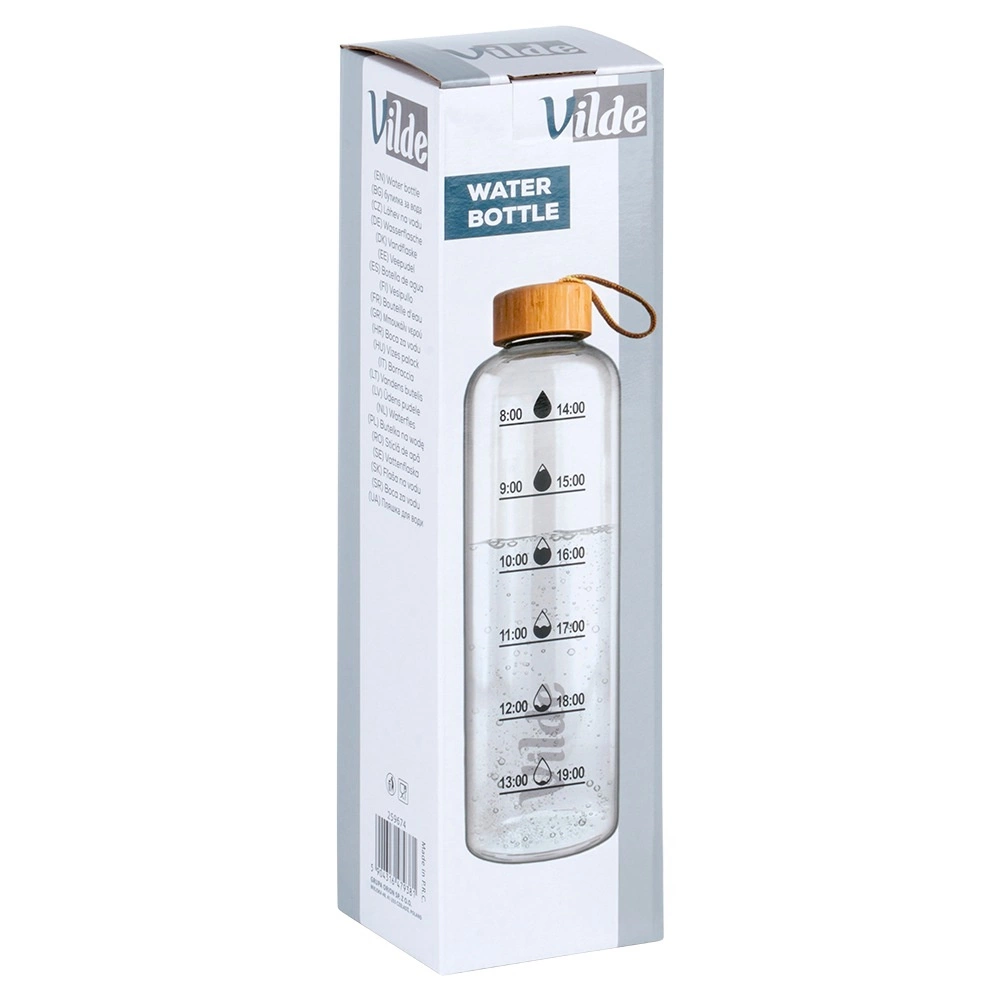 Die Glasflasche VILDE verbindet klares Design mit alltagstauglichen Funktionen. Hergestellt aus Borosilikatglas, das leicht, langlebig und temperaturbeständig ist – ideal für Wasser, Tee und hausgemachte Limonaden. Der Bambusdeckel mit Silikondichtung hält den Inhalt zuverlässig im Inneren, und dank der Schlaufe lässt sich die Flasche bequem transportieren.