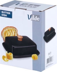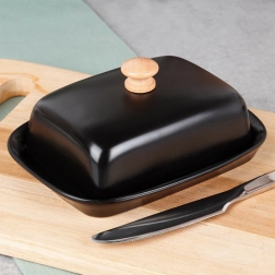 Diese stilvolle Butterdose aus hochwertiger Keramik in schwarzer Ausführung ist ideal für den täglichen Gebrauch zu Hause und zum Servieren am Tisch. Der Holzgriff am Deckel ermöglicht ein komfortables Anheben, während die dicht schließende Abdeckung die Butter vor dem Austrocknen und vor Fremdgerüchen schützt.