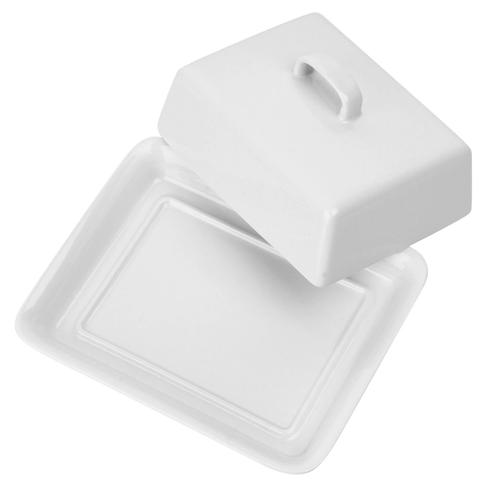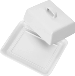 Elegante keramik-Butterdose in Weiß zum Aufbewahren und Servieren von Butter. Die kompakten Maße 16 × 13 × 7 cm, die klassische Form, der praktische Deckel mit Griff und die einfache Reinigung machen dieses Stück zu einem stilvollen und hygienischen Accessoire für jede Küche.