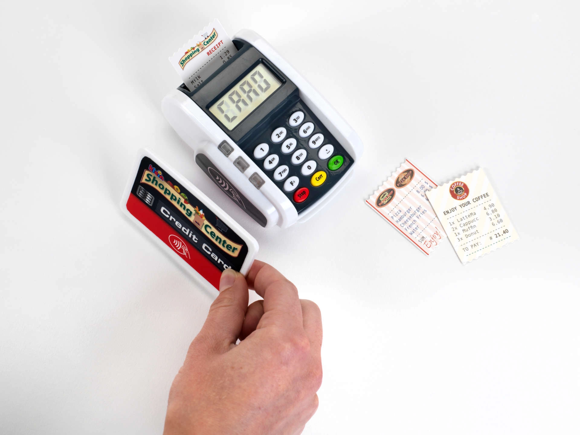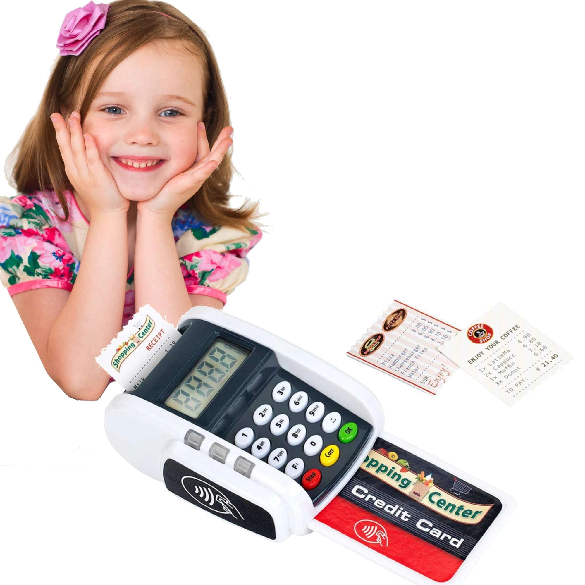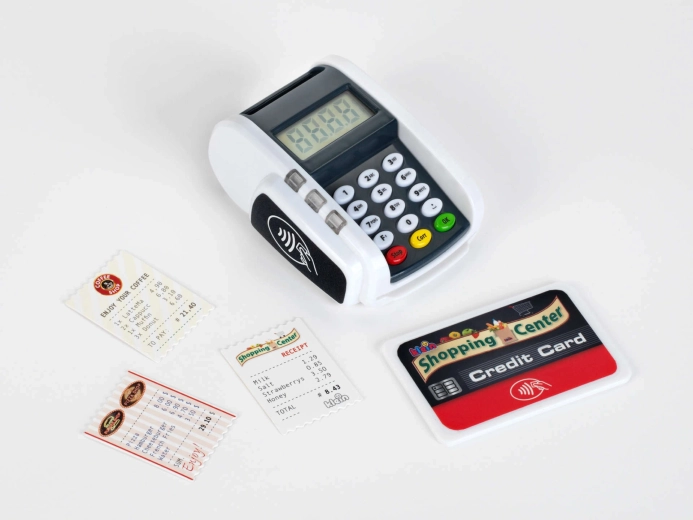 Dieses kompakte Terminal ahmt ein echtes Gerät überzeugend nach: Kinder können die Zifferntastatur drücken, eine Zahlungskarte auflegen und „Kassenbons“ drucken – für ein realistisches Kassen-Spiel. Licht- und Soundeffekte geben jeder Transaktion den richtigen Hauch von Realität und fördern soziale Kompetenzen.