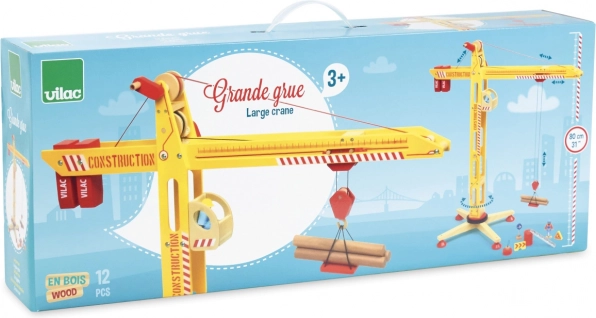 Der große Holzkran von VILAC begeistert kleine Baumeister mit realistischer Ausführung – von der Kabine über das Gegengewicht bis zur funktionalen Katze. Dank der breiten Basis ist der Kran besonders stabil und sicher. Kinder können den Kran frei drehen sowie Lasten heben und verschieben mittels zweier sanft laufender Kurbeln, was Motorik, Vorstellungskraft und Rollenspiel fördert.