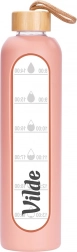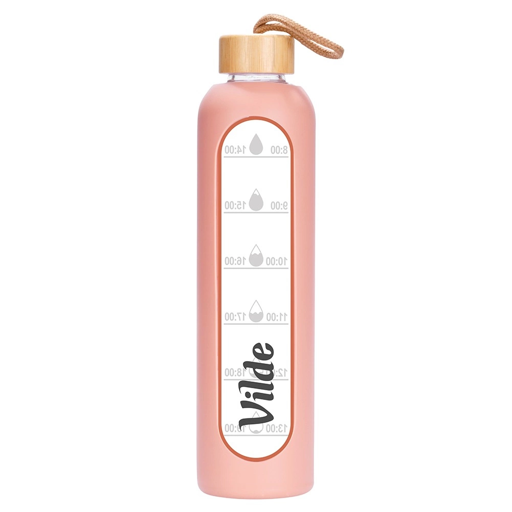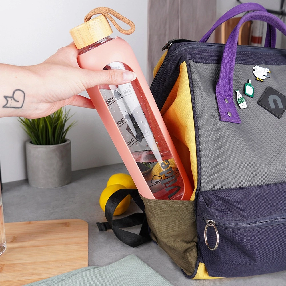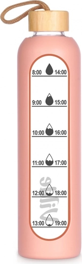 Bleiben Sie stilvoll hydriert. Diese lachsrosa Flasche verbindet elegantes Design mit Funktionalität: robustes Borosilikatglas, ein sicherer Bambusdeckel mit Textilschlaufe und eine Silikonhülle für festen Griff und Schutz vor Bruch. Dank der Zeitmarkierungen behalten Sie Ihre Wasseraufnahme den ganzen Tag über im Blick.