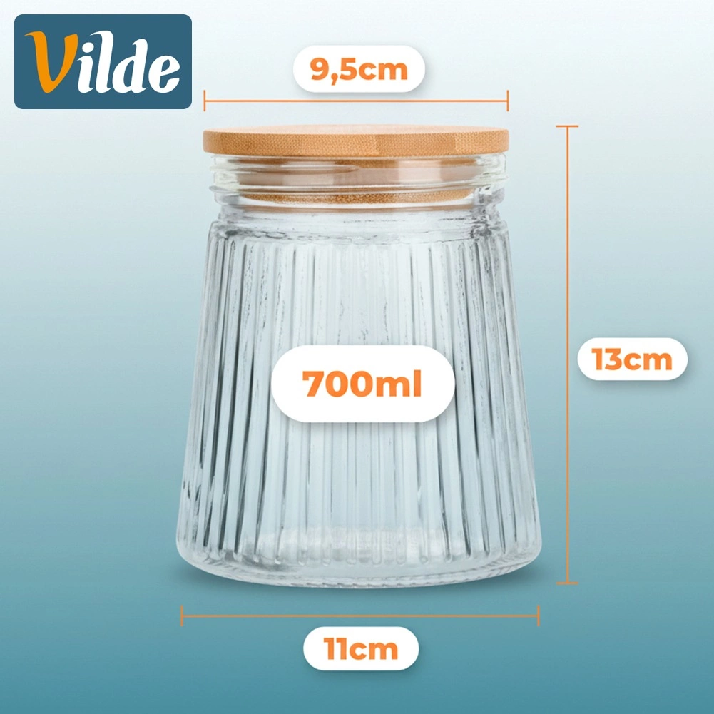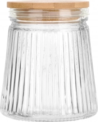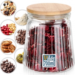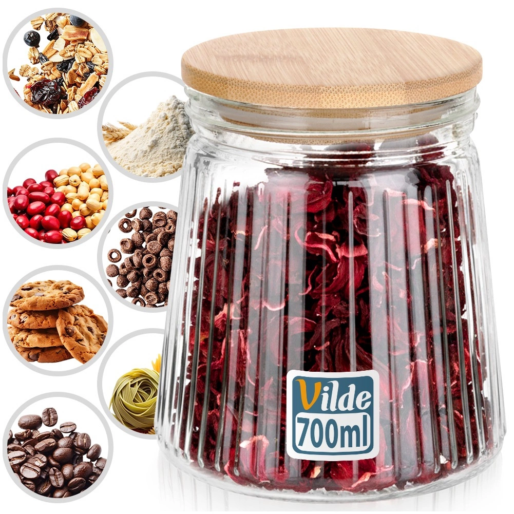 Elegante Glasdose mit 700 ml Volumen, Bambusdeckel und Silikondichtung hält Ihre Lebensmittel länger frisch und aromatisch. Hergestellt aus robustem Borosilikatglas mit dekorativer Riffelung, bietet sie luftdichten Verschluss, einfache Inhaltskontrolle und stilvolle Küchenorganisation. Der Glasteil ist spülmaschinengeeignet (Deckel per Hand reinigen).