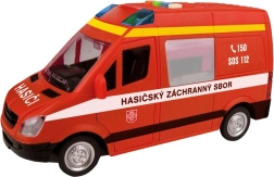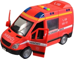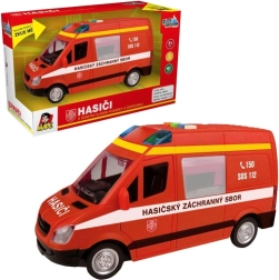 Dieser Feuerwehr-Lieferwagen begeistert alle kleinen Retter durch seine realistische Ausführung und Funktionen. Beim Drücken der Tasten hörst du tschechische Stimmen der Leitstelle und Besatzung und siehst das blinkende Blaulicht. Dank des Schwungradantriebs schiebst du das Fahrzeug einfach an und es fährt nach vorn.