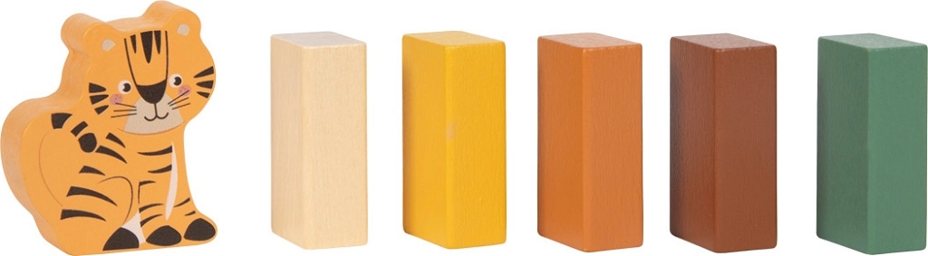 Bunte Ziegel, stabiler Rahmen, zwei Stäbchen und eine Tigerfigur – alles aus 100 % FSC®-Holz mit glatter Oberfläche.