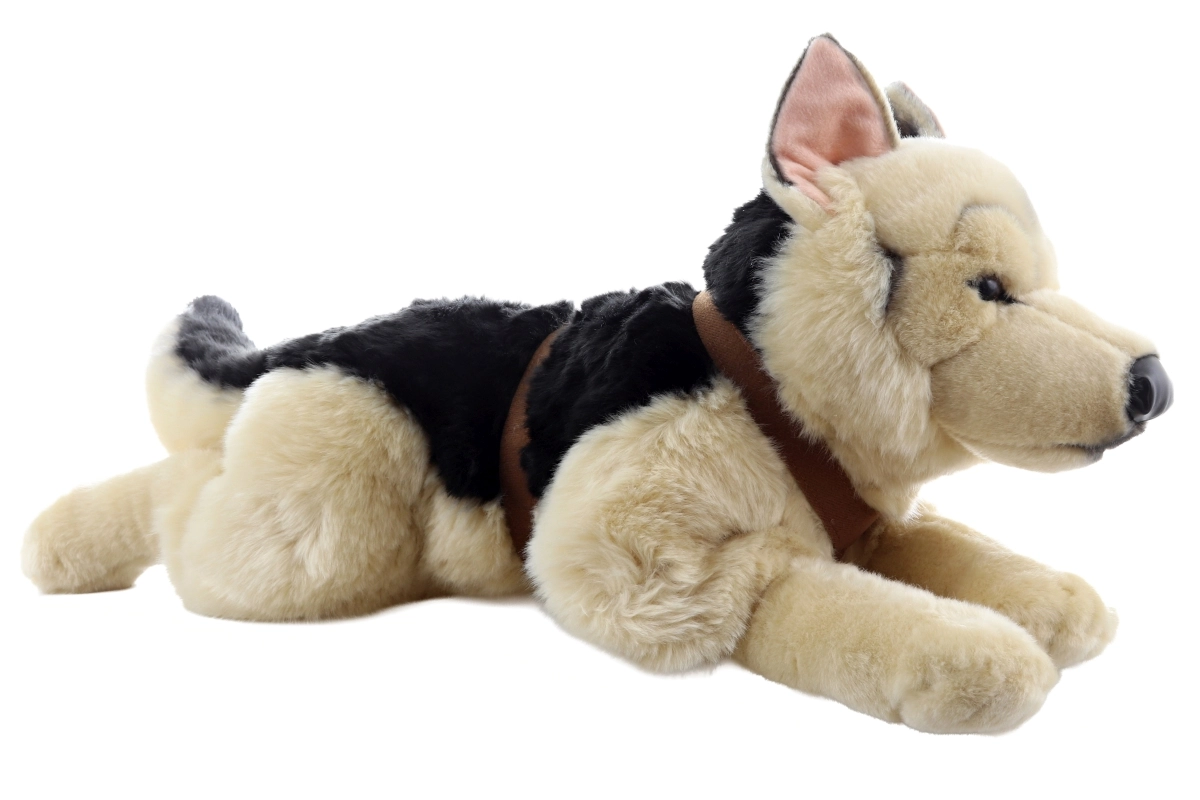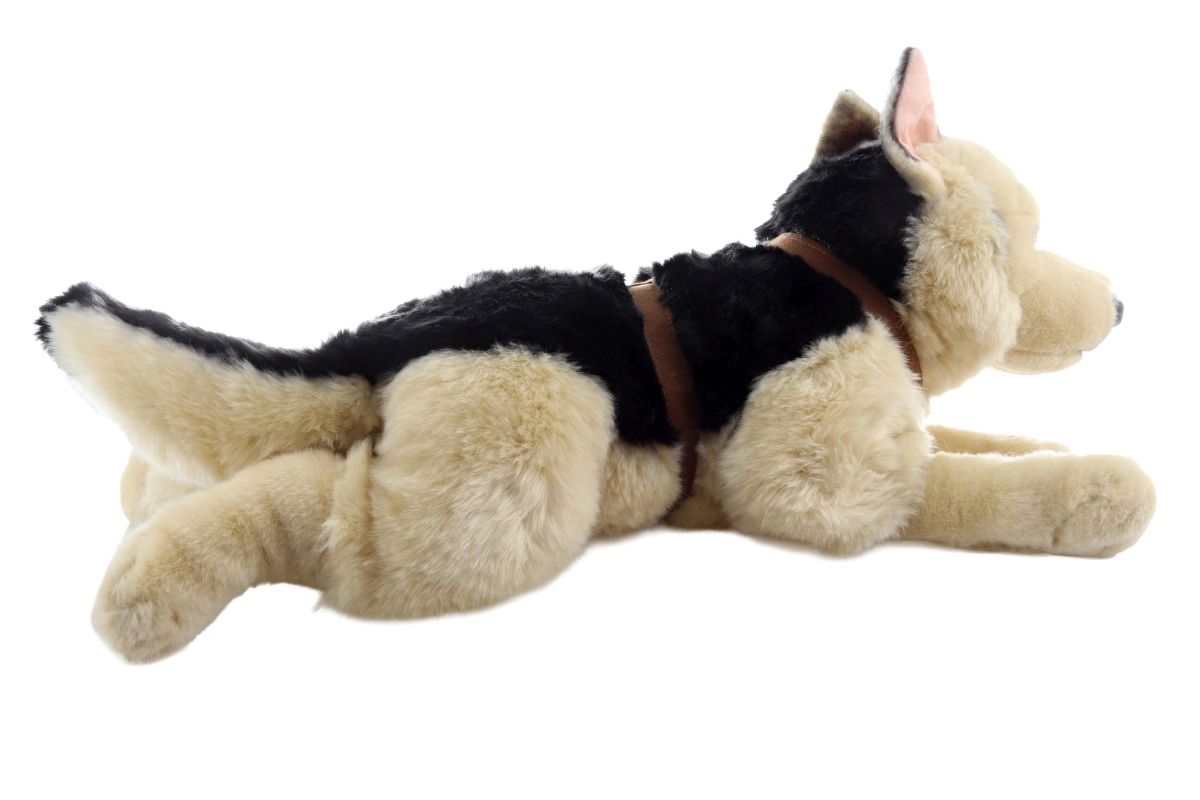 Ein niedlicher plüschiger Deutscher Schäferhund in liegender Position erfreut Kinder und Hundefans gleichermaßen. Er hat eine realistische Farbgebung, ist kuschelweich und lässt sich angenehm umarmen. Geeignet ab 3 Jahren. Weiches Material, detailgetreu, dekorativ und zum Spielen.